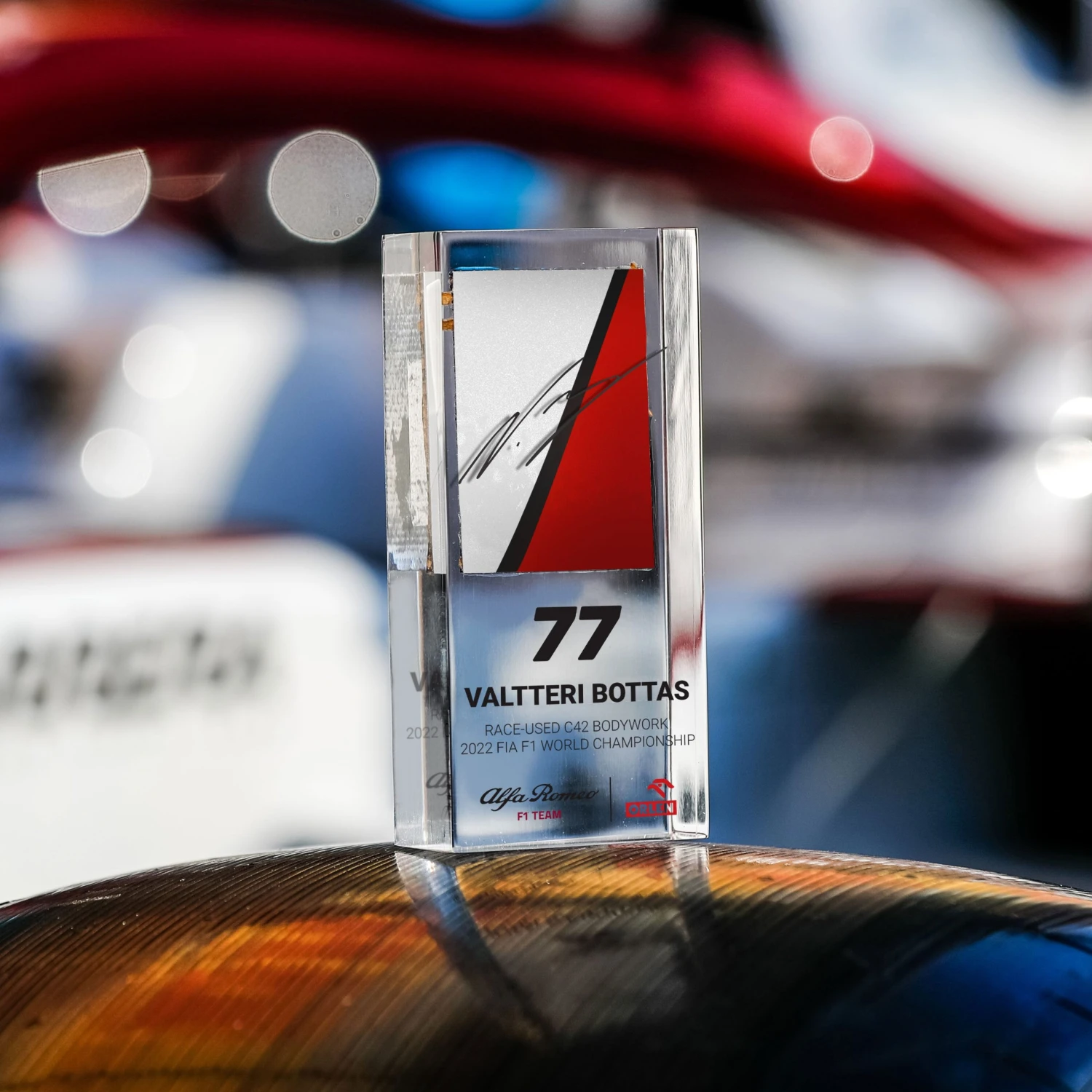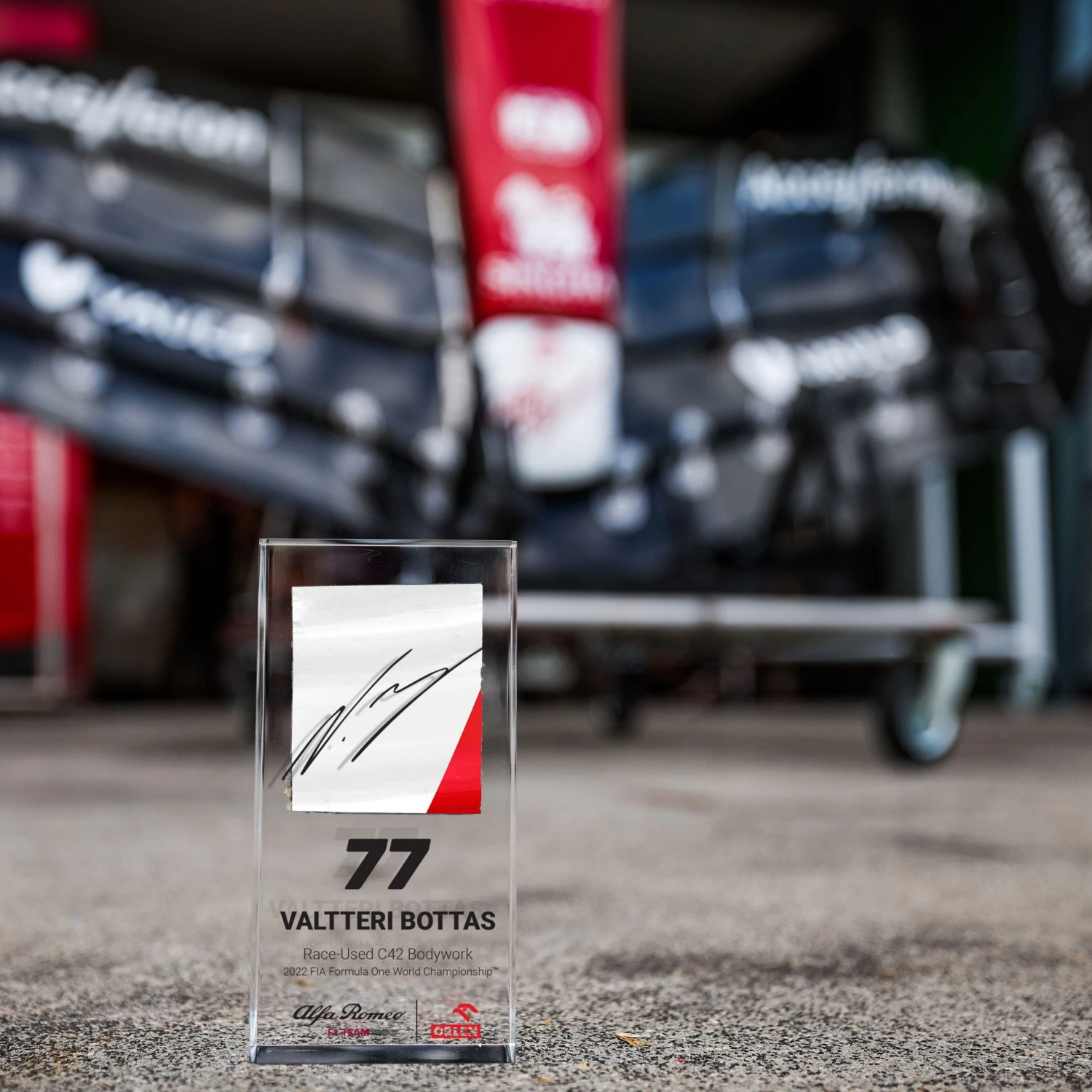 Own a piece of race used 2022 Alfa Romeo F1 Team ORLEN bodywork with this hand-cut piece embedded within sleek acrylic featuring a digital floating Valtteri Bottas signature.