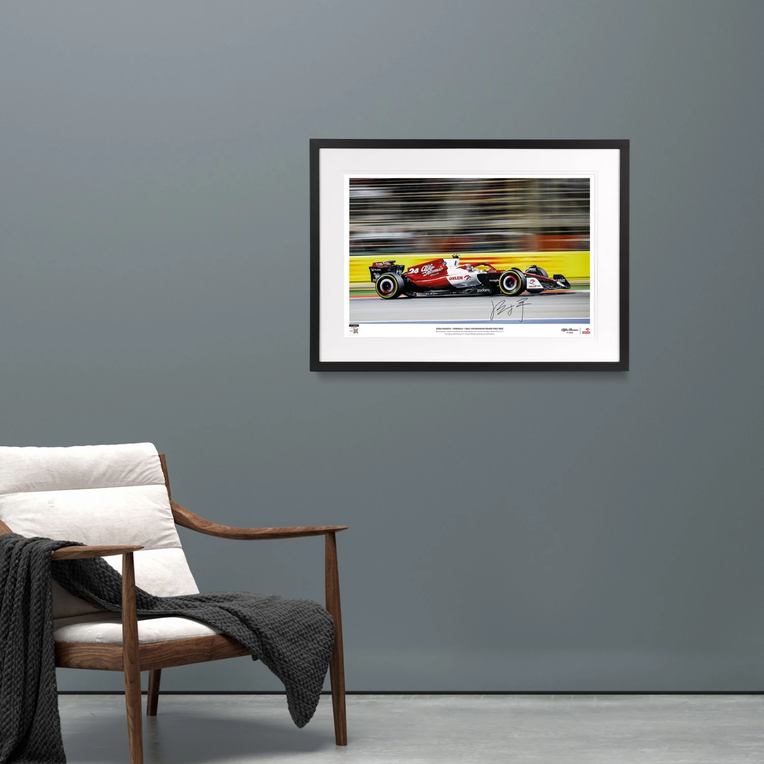 Celebrate Chinese driver, Zhou Guanyu, and his maiden F1 race at the 2022 Bahrain Grand Prix, with this special print, personally signed by the rookie himself.
