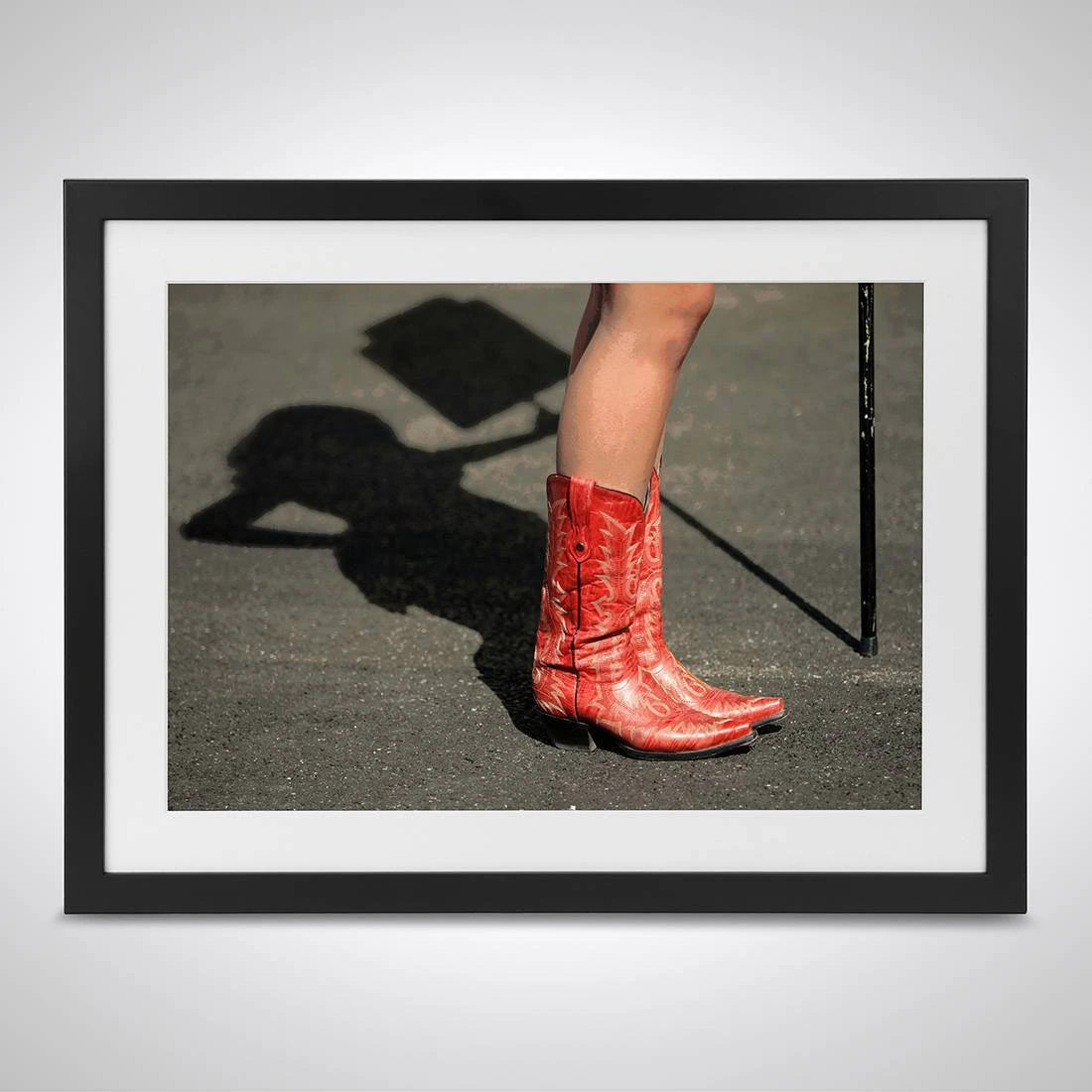 The ‘Austin Grand Prix’ art print features the striking red cowboy boots of an Austin Grand Prix grid girl at the Circuit of the Americas, Austin, Texas in 2012. Her pit-board shadow is cleverly captured in the bright Texas sunshine which subtly reveals her F1 role.