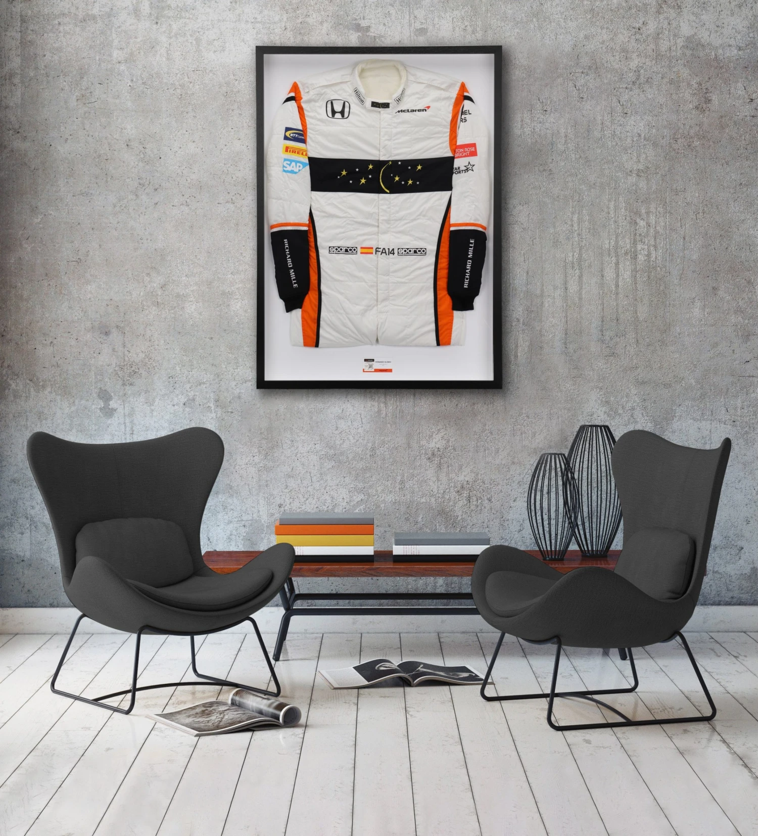 This official replica race suit has been made using similar materials to the original and features the striking McLaren liveries and Chandon detailing. It comes professionally framed and ready to showcase.