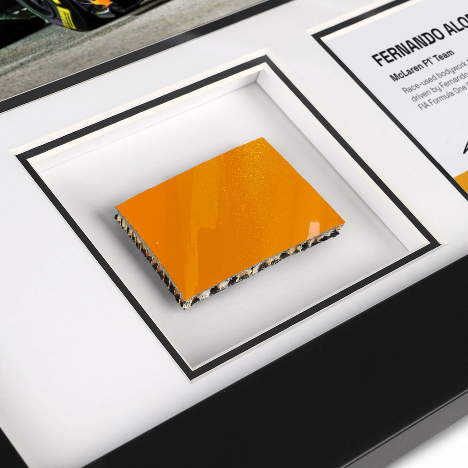 Hand-cut from the McLaren race car that Fernando drove during the 2018 FIA Formula One World Championship, this unique piece of bodywork is now presented alongside a photograph of the two-time Champion and comes professionally framed ready to display.