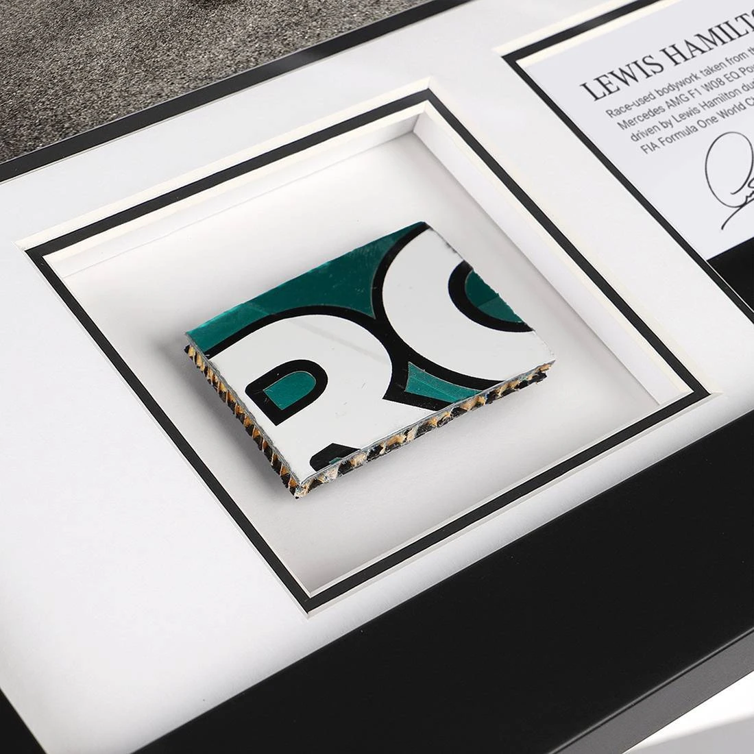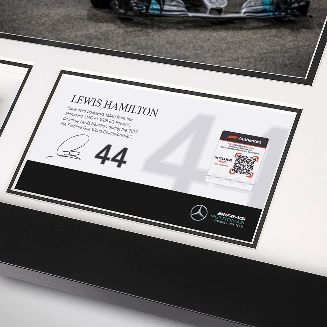 Complete with authentic hologram and a printed Hamilton signature, this bodywork and photo is the perfect piece of F1 memorabilia, and a fantastic way to celebrate the dominance and successes of one of the greatest F1 drivers of all time.