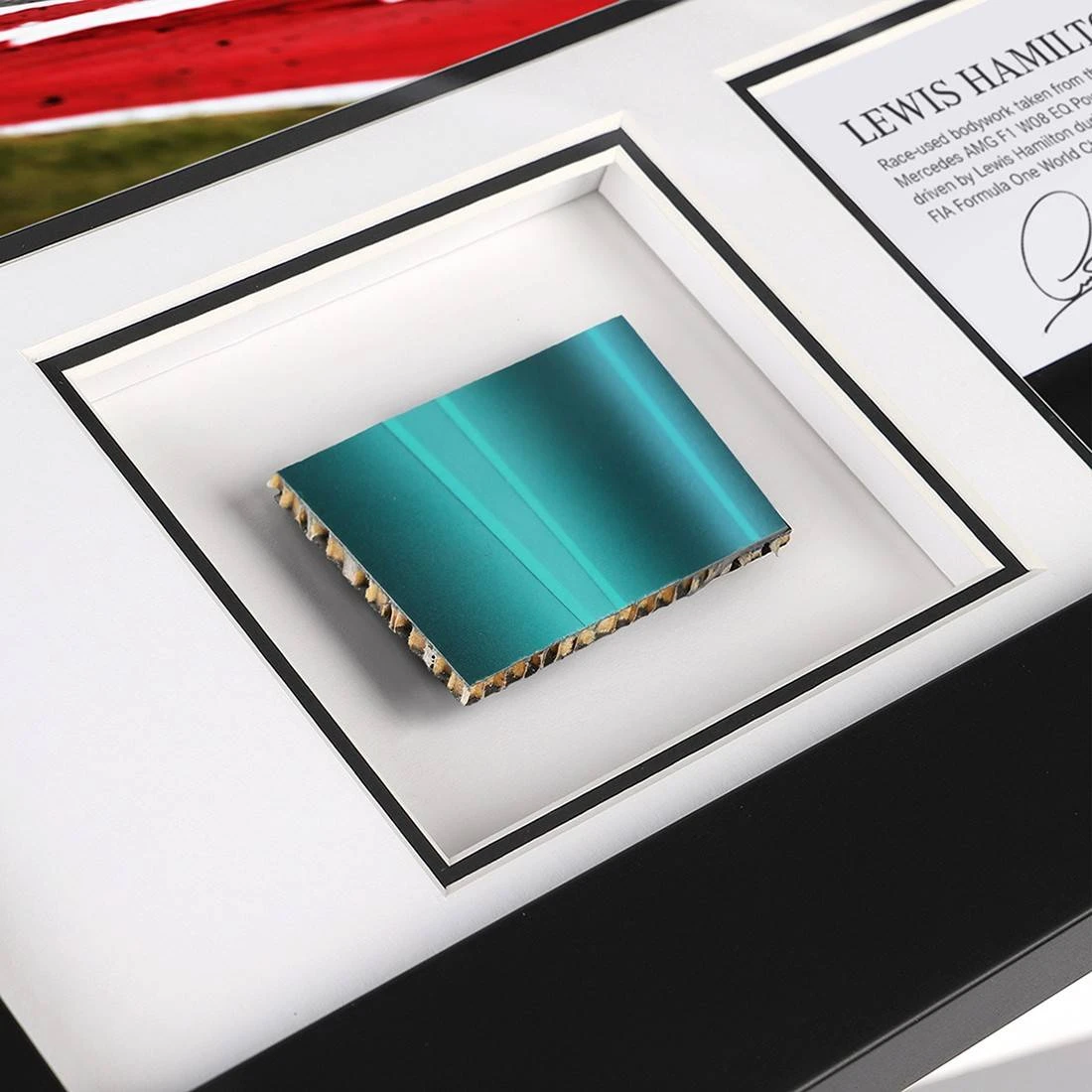 To add a touch of racing action to this impressive photograph, within the frame comes an actual race-used piece of F1 bodywork, taken from Lewis’ 2017 F1 race car. Each piece is unique!