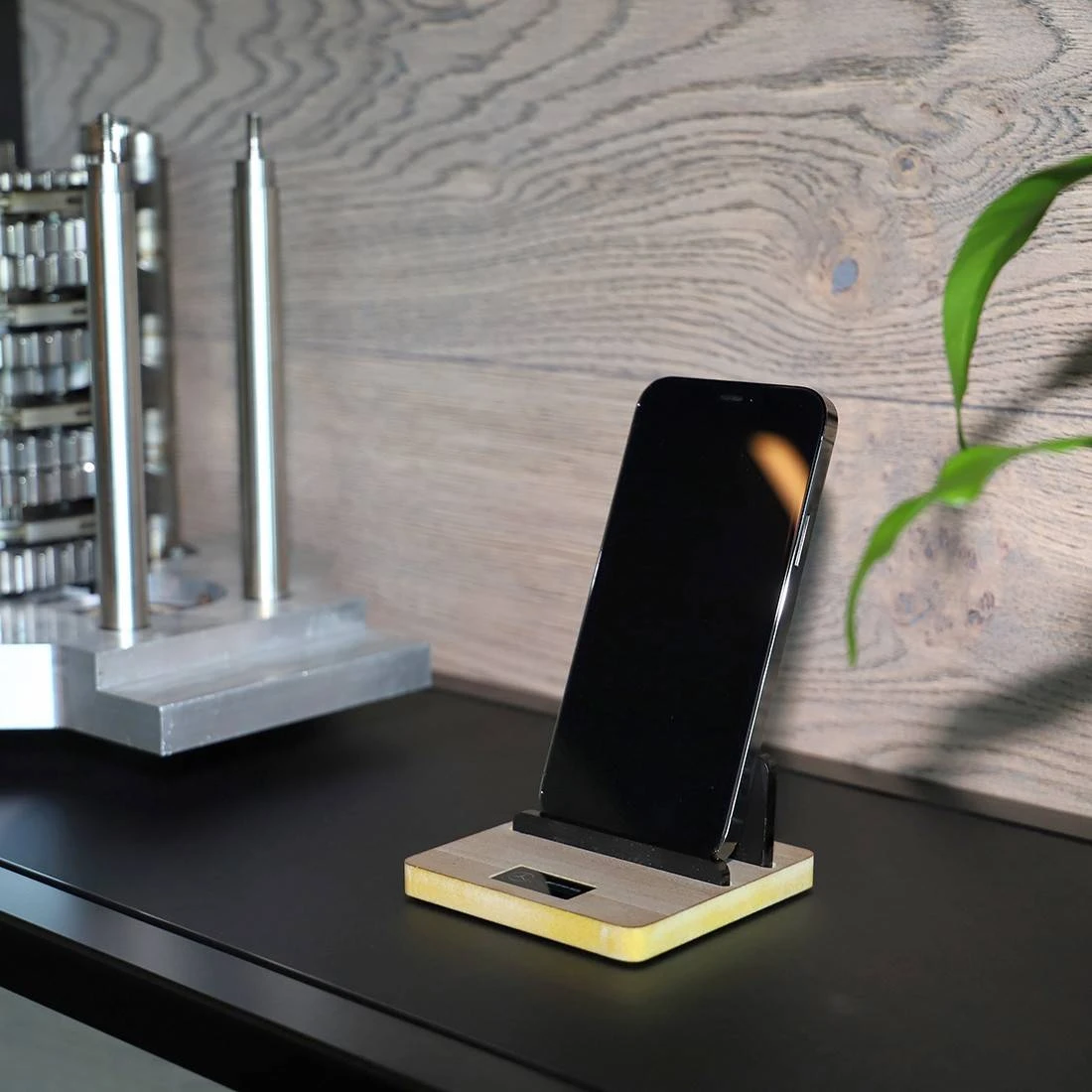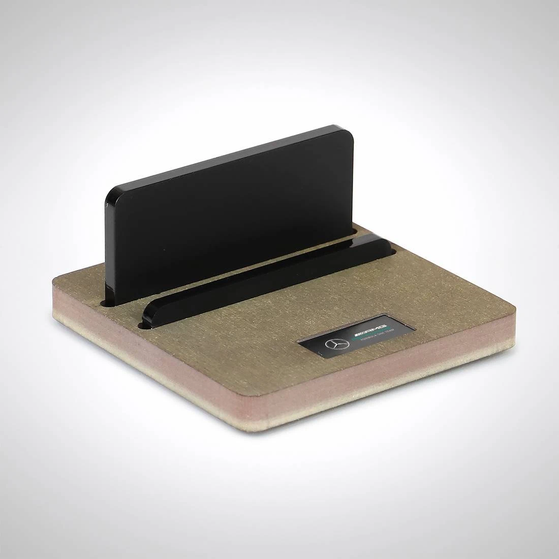 The natural colours of the skid block are complemented with black acrylic pieces to support your mobile phone at the perfect angle for reading, watching, charging, or simply for stylish storage. The finishing touch is the official Mercedes-AMG Petronas Formula One Team logo plaque.