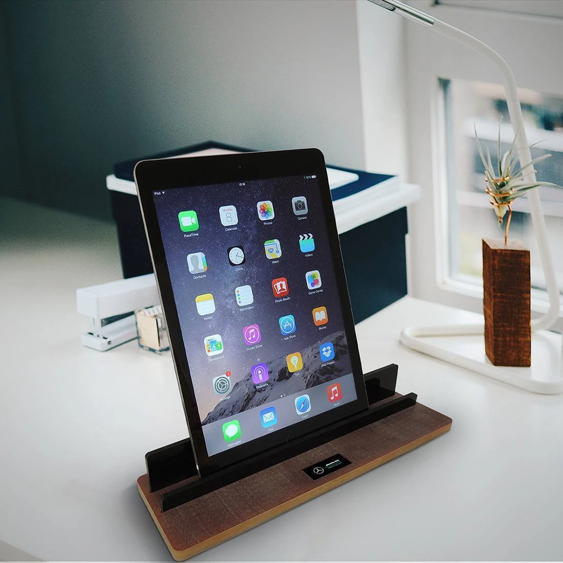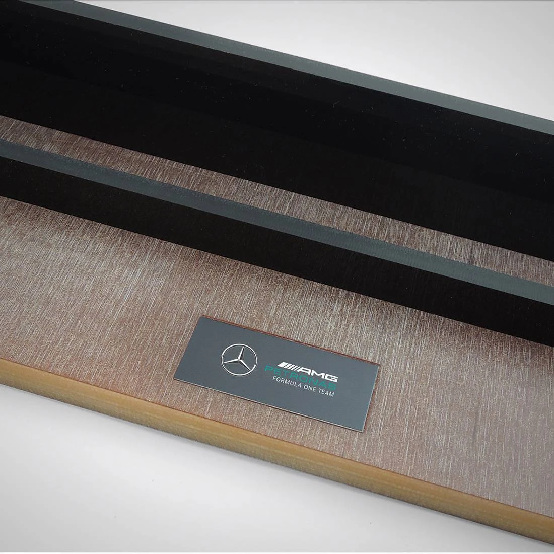 The natural colours of the skid block are complemented with black acrylic pieces to support your tablet at the perfect angle for reading, watching, charging, or simply for stylish storage. The finishing touch is the official Mercedes-AMG Petronas Formula One Team logo plaque.