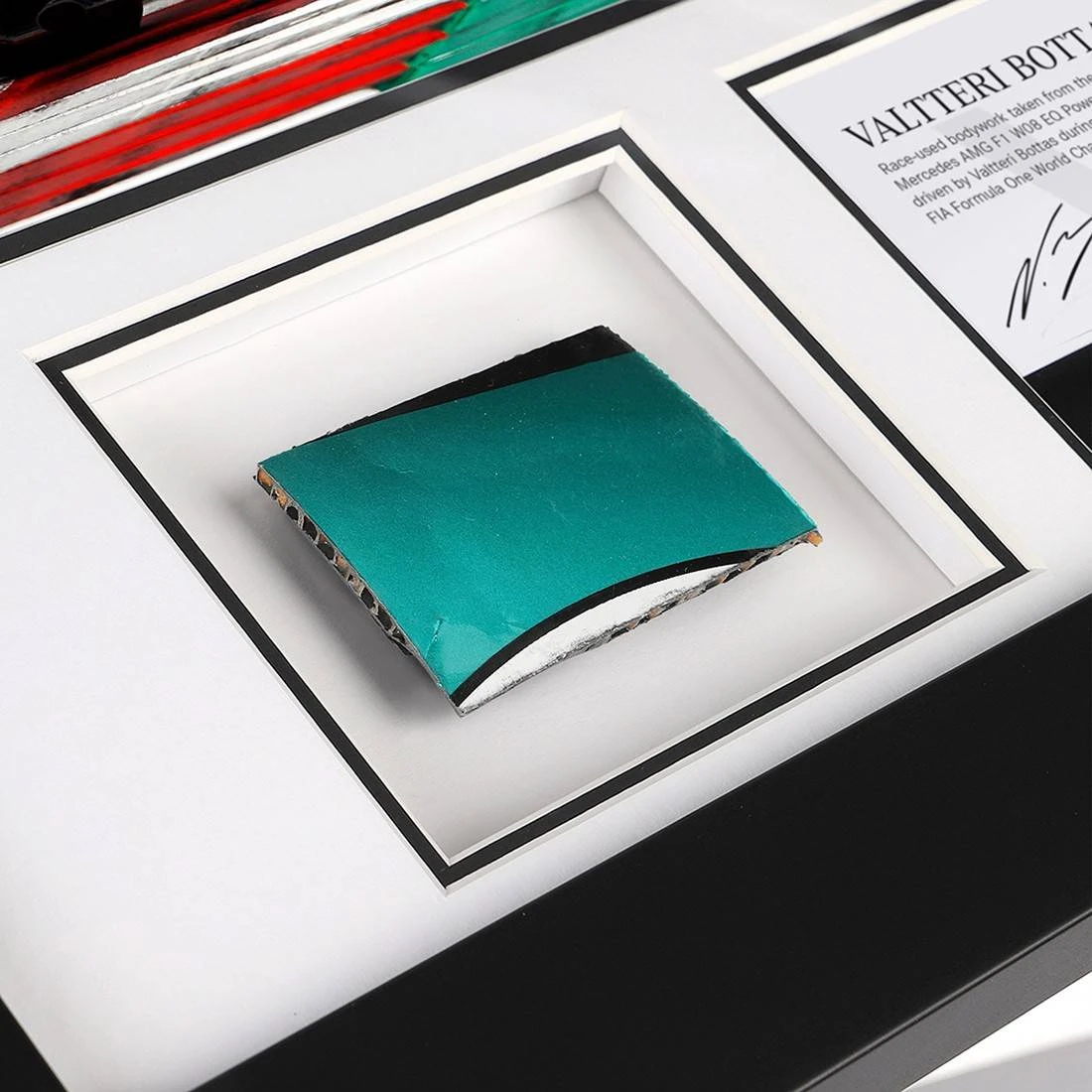 That’s right, this bodywork has been hand cut from one of the sidepods of his 2017 Mercedes-AMG F1 car and added alongside this exceptional print for the ultimate memento.