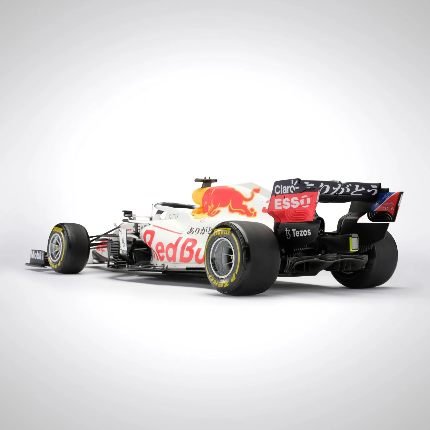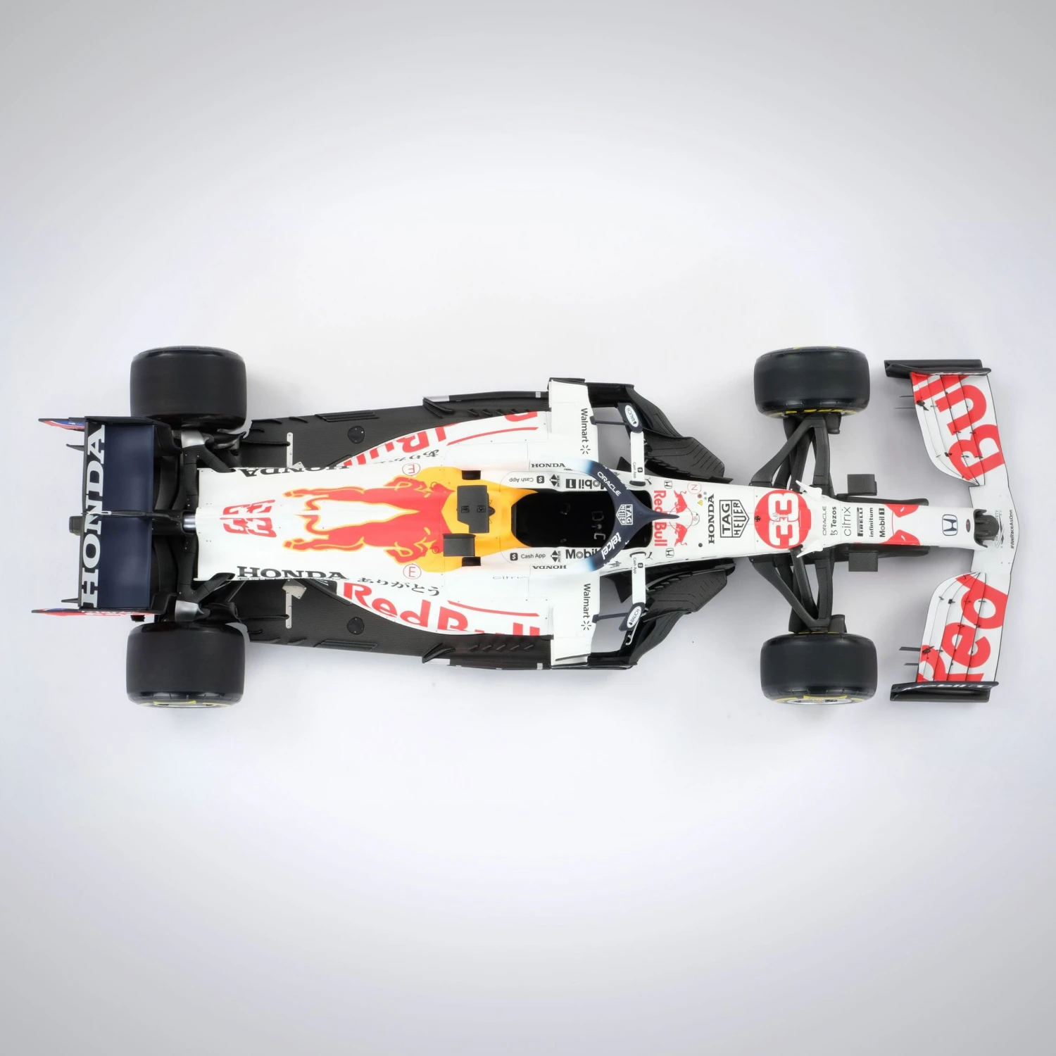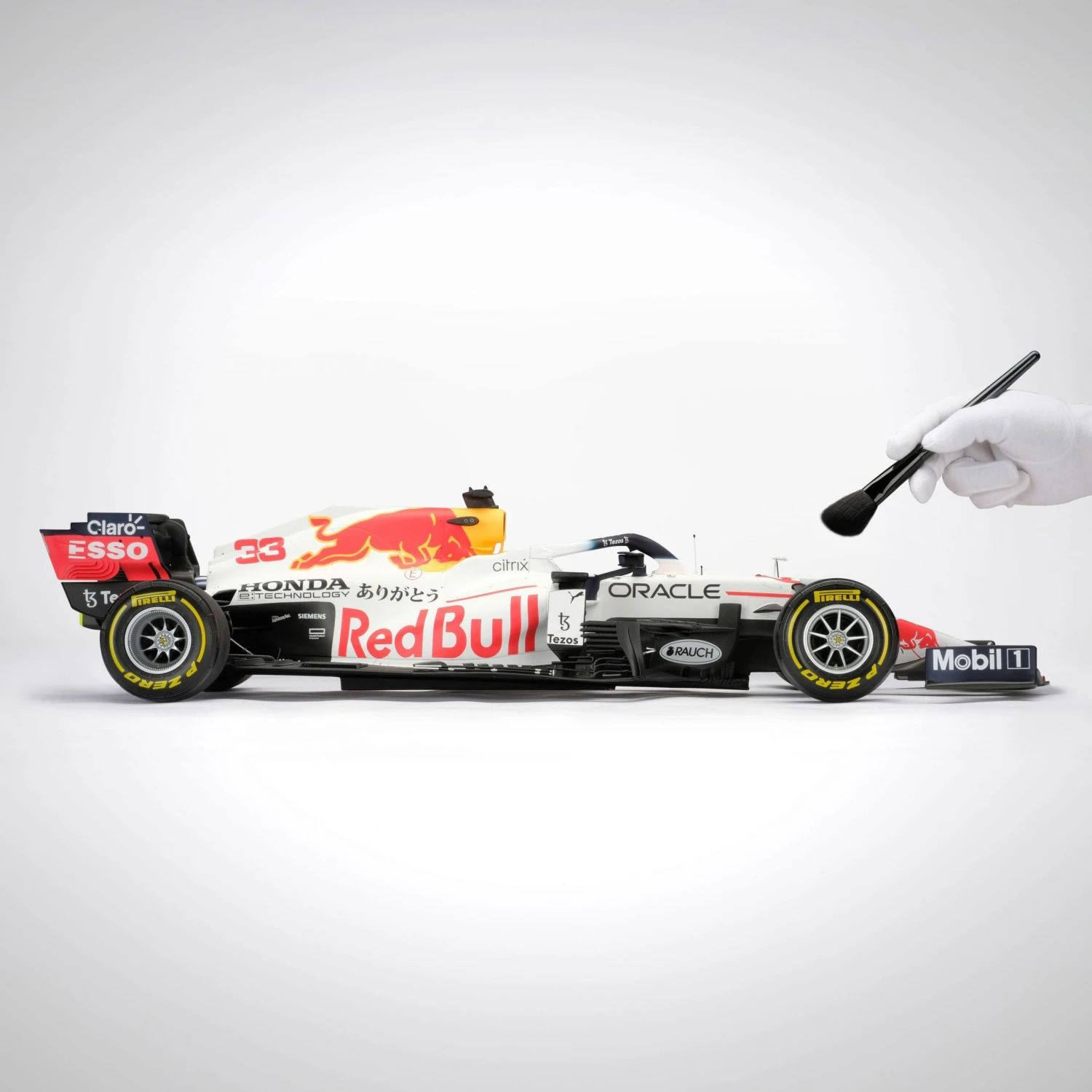 Own a special 1:8 scale model of Max Verstappen’s Red Bull RB16B race car, featuring the special liveries that were displayed on the cars for the 2021 Turkish Grand Prix. The special white liveries paid tribute to the team’s engine partner, Honda.