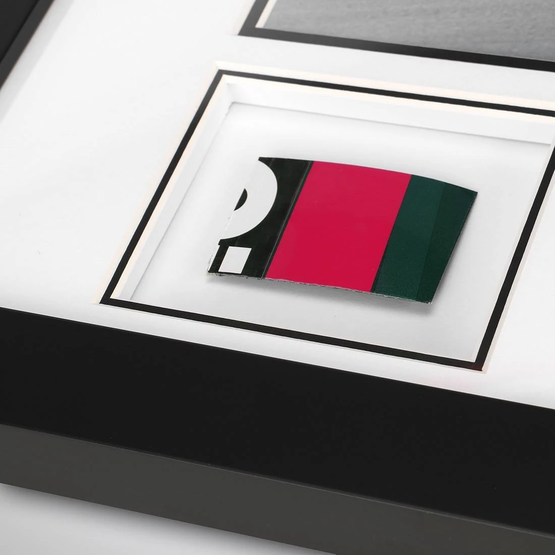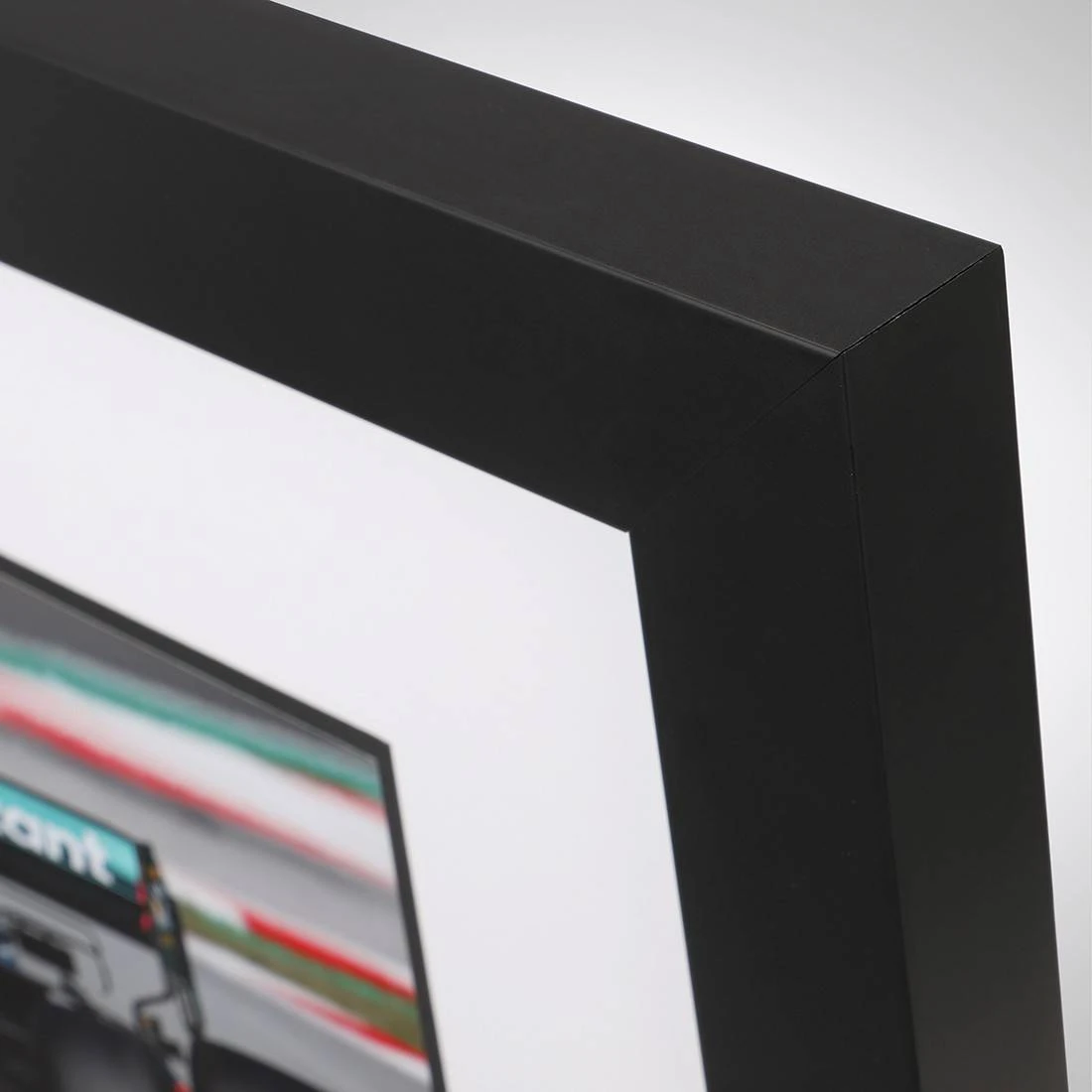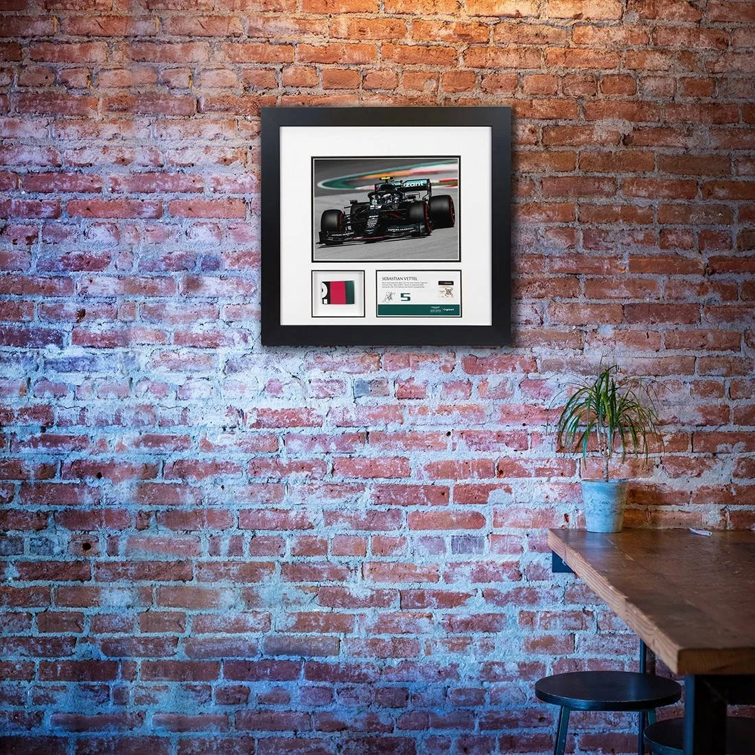 Own a genuine piece of Sebastian Vettel’s F1 race car! The perfect piece of F1 memorabilia, this framed photograph captures Aston Martin driver, Sebastian Vettel, racing in 2021 and features a real piece of his car’s bodywork.